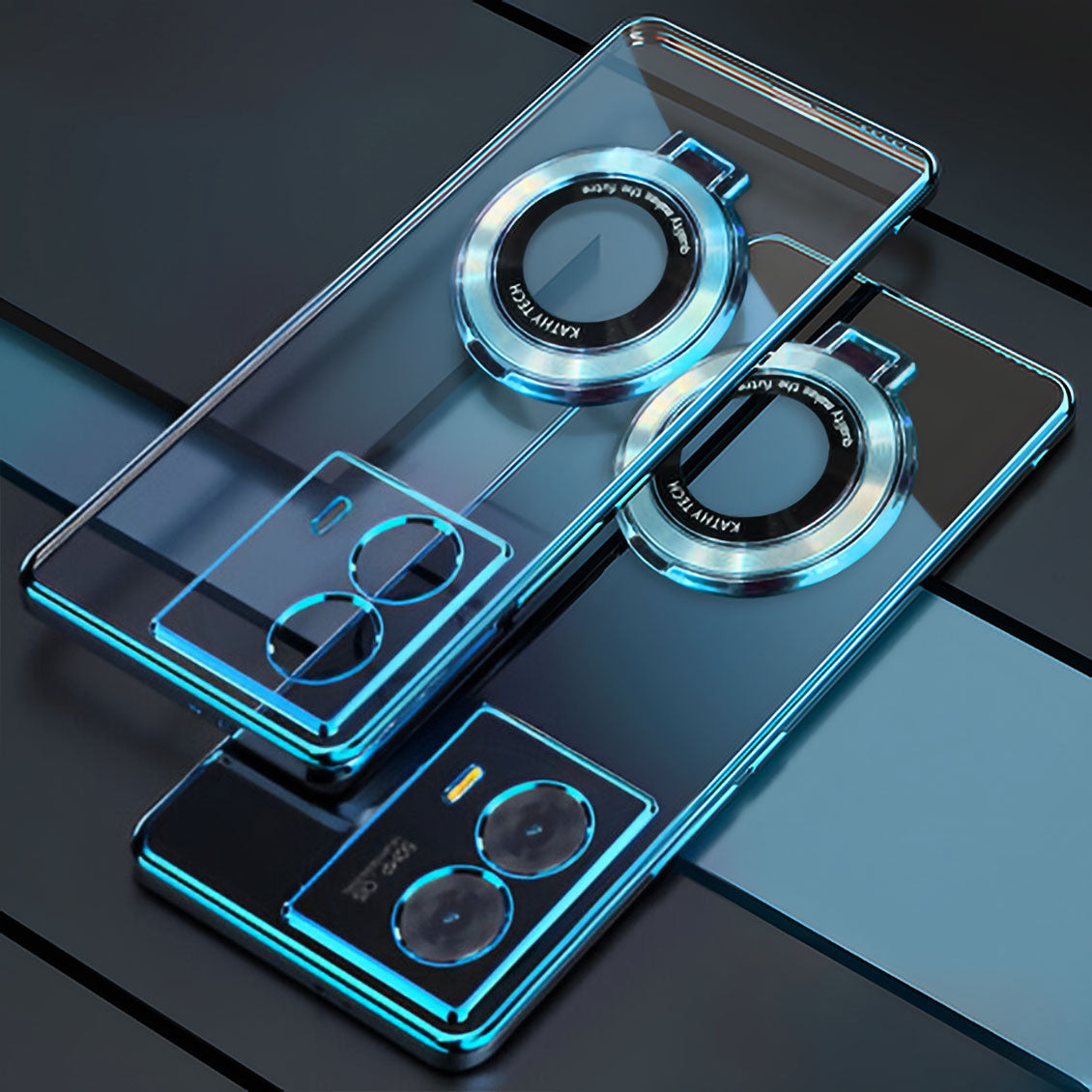 This luxury smartphone case features a sleek and transparent electroplated design with a glossy blue outline that enhances the overall aesthetics of the phone. The back showcases a unique matte pattern, offering a premium tactile feel that is both stunning and elegant. Designed with precision, the case provides an exact fit, ensuring no sliding or misalignment.